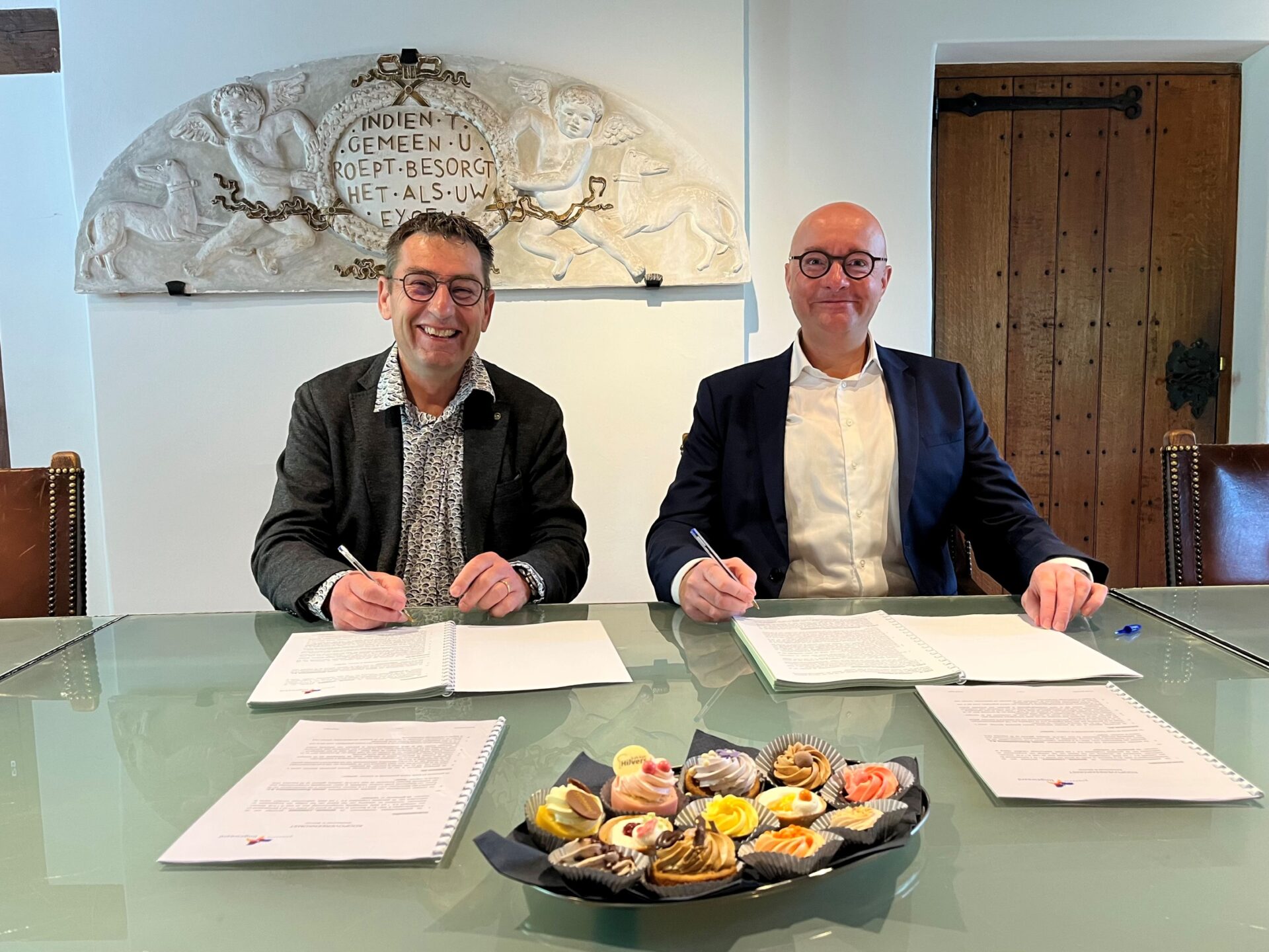 Foto: René Derksen (wethouder gemeente Lingewaard) en Jeroen Jeukens (directeur Jansen Bouwontwikkeling) ondertekenen de overeenkomst