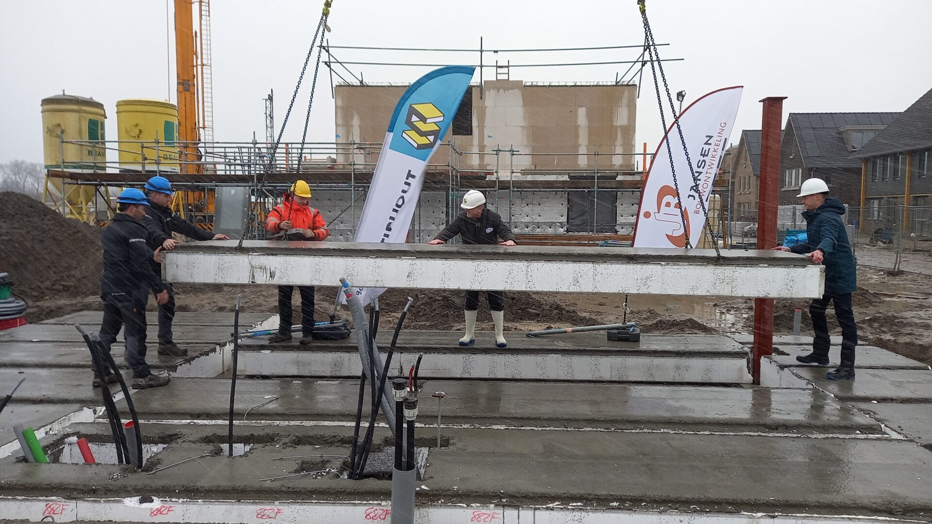Hoef en Haag, 10 maart 2023 – Het jonge dorp Hoef en Haag wordt uitgebreid met 38 duurzame woningen. Wethouder Economie Ton van Maanen van de gemeente Vijfheerenlanden, hoofd uitvoerder Jurgen van Gils en uitvoerder Gijs van der Heijden van Bouwbedrijf van Stiphout en projectmanager Luc Peters van Jansen Bouwontwikkeling B.V. gaven in het gezelschap van de kopers en betrokkenen het officiële startsein voor de bouw van de woningen door de laatste begane grondvloer te leggen.