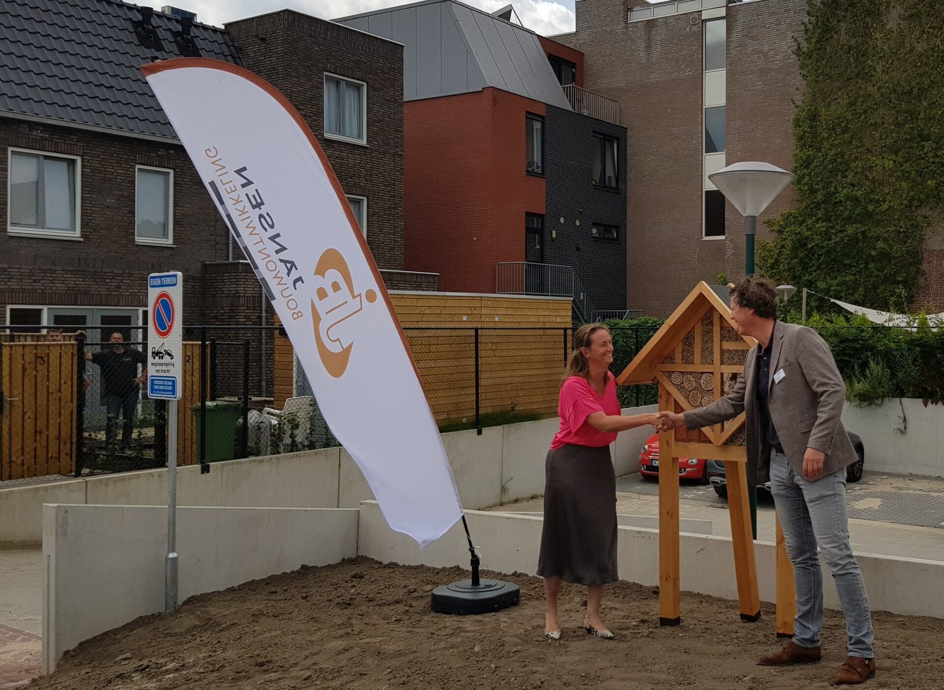 Wethouder Bouke van Vught van de gemeente Land van Cuijk en Marco Leenders, projectmanager bij Jansen Bouwontwikkeling B.V. legden bij de Carmelhof, in aanwezigheid van een klein gezelschap van gemeente Land van Cuijk, Jansen Bouwontwikkeling, adviseurs, uitvoerende partijen én bewoners van de Carmelhof en Titus Brandsmaplein, de laatste hand aan de woonbuurt. Bij het hofje onthulden zij het insectenhotel waar diverse soorten insecten kunnen nestelen wat bijdraagt aan het behoud van de biodiversiteit. De aanplant van de bomen laat nog even op zich wachten tot het daarvoor geschikte seizoen.