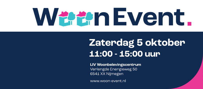 Natuurlijk zijn wij dit jaar weer aanwezig bij het WoonEvent! Op deze dag informeren wij je graag over de diverse in verkoop zijnde nieuwbouwprojecten én over onze toekomstige projecten in de regio Nijmegen, Maas en Waal, Land van Cuijk en Overbetuwe. Dus heb je belangstelling? Kom dan op zaterdag 5 oktober tussen 11:00 en 15:00 uur langs bij onze stand in het LIV Woonbelevingscentrum, Verlengde Energieweg 50 in Nijmegen.