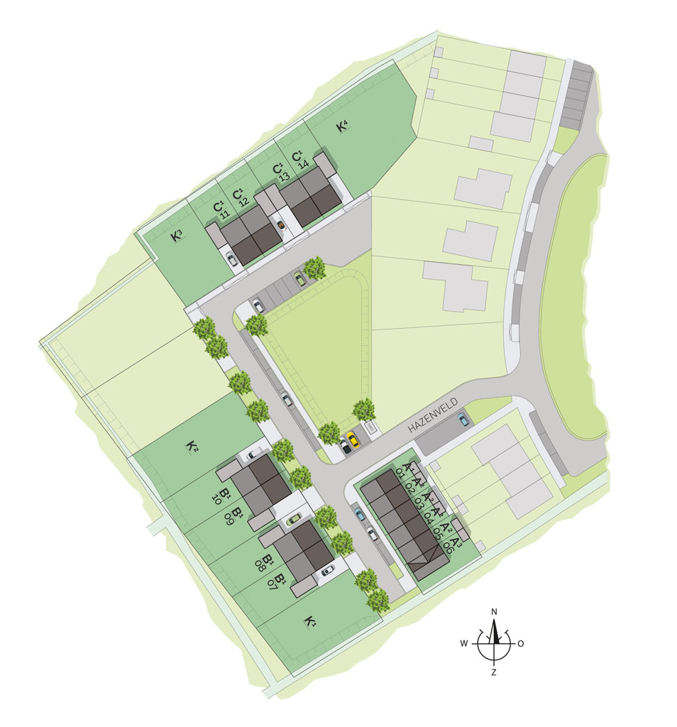 De nieuwe groene woonhof aan het Hazenveld bestaat uit 4 starterstussenwoningen, 2 hoekwoningen (1 voor starters), 8 tweekappers en 4 ruime bouwkavels voor vrijstaande woningen. De tweekappers zijn er in twee afmetingen L en XL, aan jou de keuze. De architectuur? Modern eigentijds. Zelfs een tikkeltje eigenwijs. Er zijn diverse mogelijkheden om de woningen aan te passen aan de hand van specifieke woonwensen.